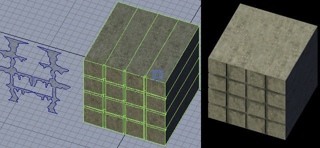 引用: | 特に屋上の壁面や床の黒いシミなどは、アメーバ状のSplineにExtudeをかけ