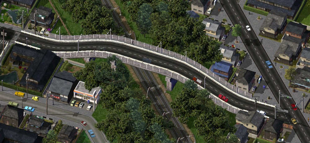 地形がでこぼこしているところに設置すると、高架上のガードレールの繋がりがおかしくなったり、高架下舗装用のPropが地面にめり込んだりと、使いにくいところも多々ありますが、宜しければ使ってみて下さい。