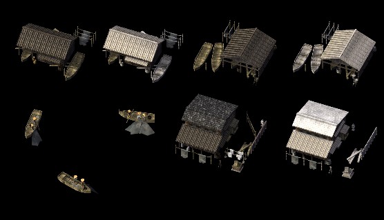 漁村BAT。「漁師小屋A」「漁師小屋B」「漁村」「漁船」の4種。